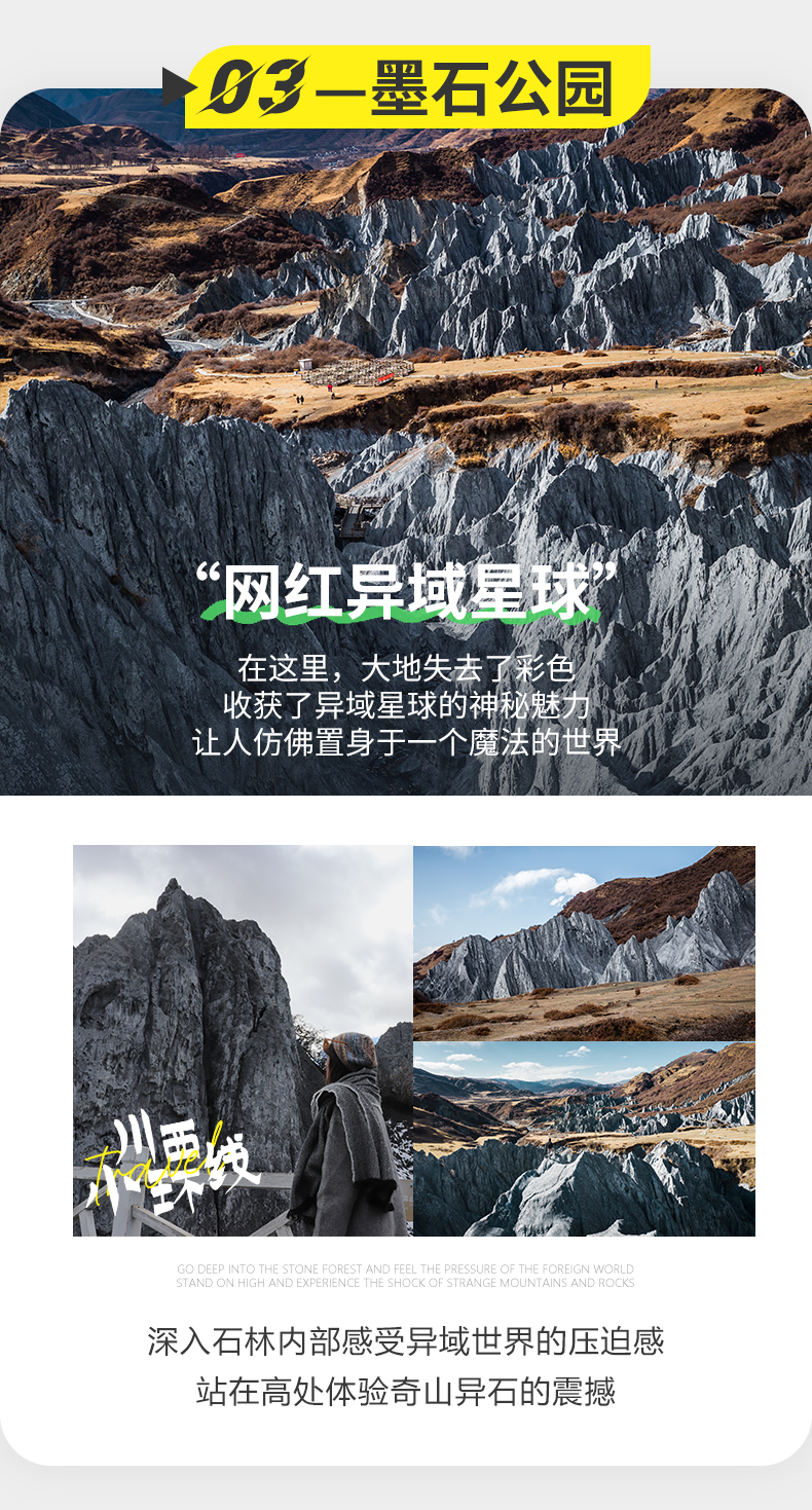 行程概览:早餐后集合前往【雅拉雪山景观景台】,欣赏一览无遗的雪山风光,出景区后在八美镇用餐,餐后前往【墨石公园】,远观八美石林,游玩时间约2小时。结束后前往【姑弄村】享受下午茶背靠座椅拍照,在这里和雪山同框非常有画面感,运气好的话可能还会看到日照金山,结束后前往新都桥酒店入住。