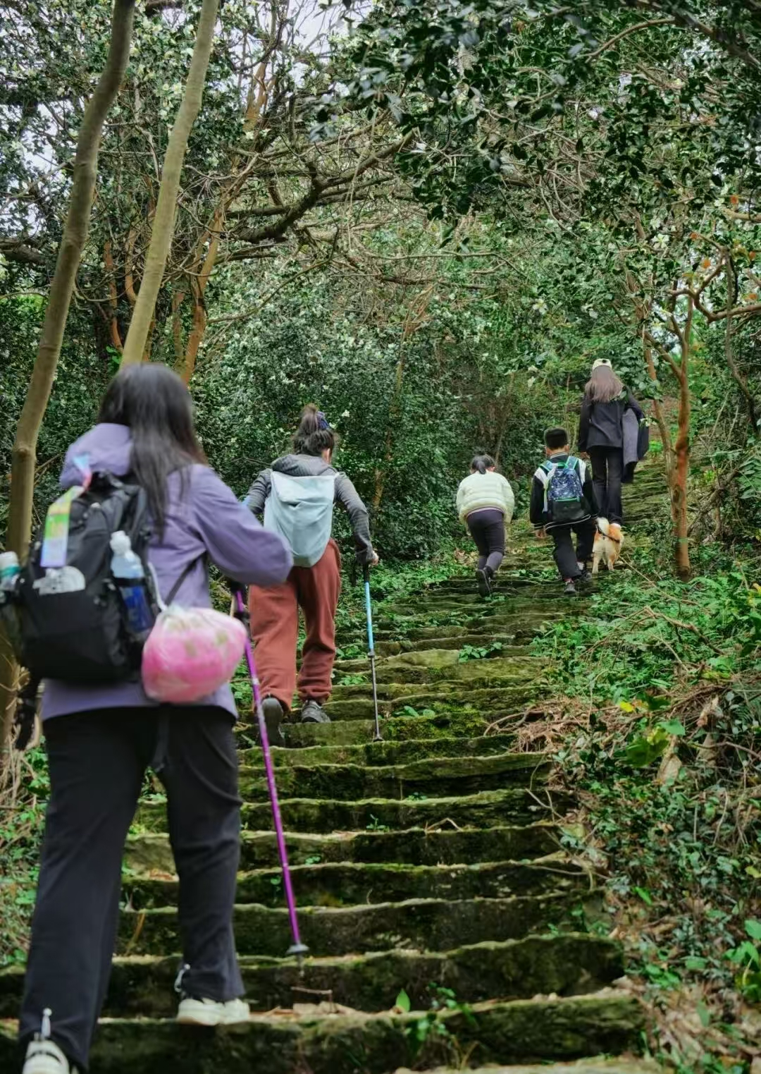 这条徒步线最让人惊喜的,莫过于沿途不断切换的绝美风光。深秋时节,步道两旁的枫树、乌桕树等纷纷变红,漫山红叶如火似霞,沿着步道蔓延开来,形成一条“红色地毯”,行走其间,仿佛置身于红色的海洋。