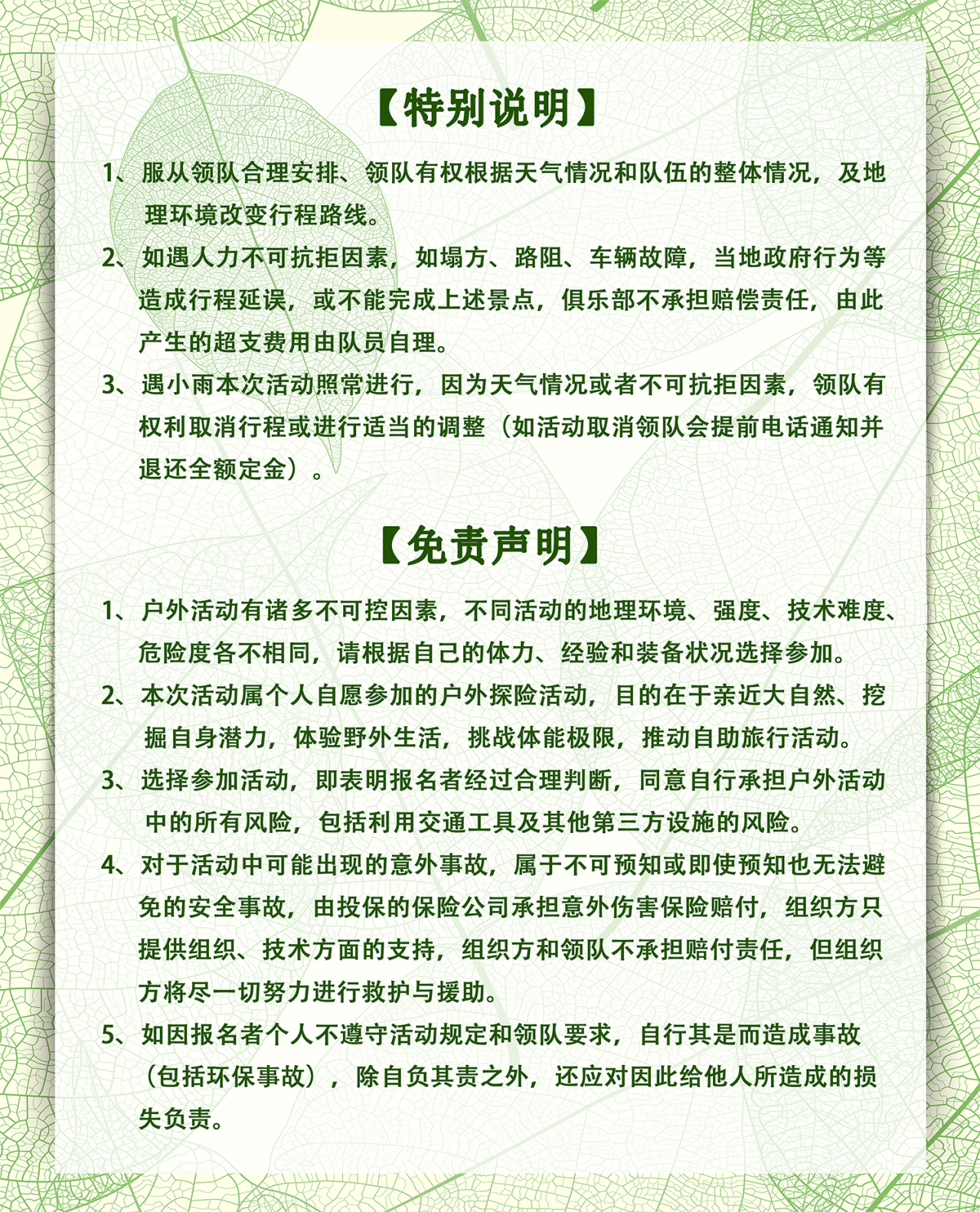 2.活动产生的垃圾一律带离,不采摘林中植物;贵重物品及钱包等随身携带,丢失自理;因为天气情况或者不可抗拒因素,在不减少景点的情况下,领队有权改变行程游览顺序。