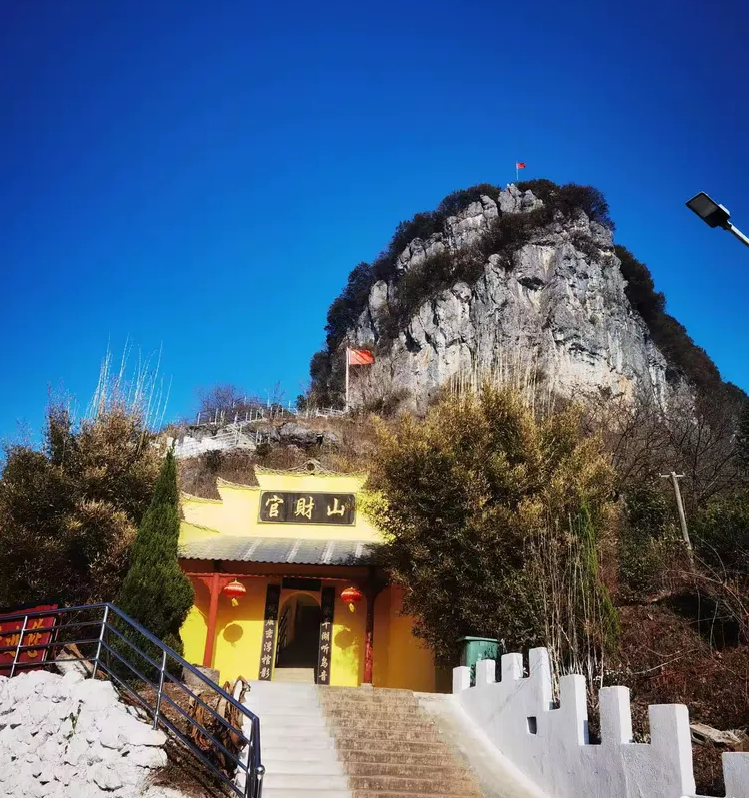 官财山山形奇特,主峰海拔482.5米,东北连马鞍山,北、西、南三面环水。