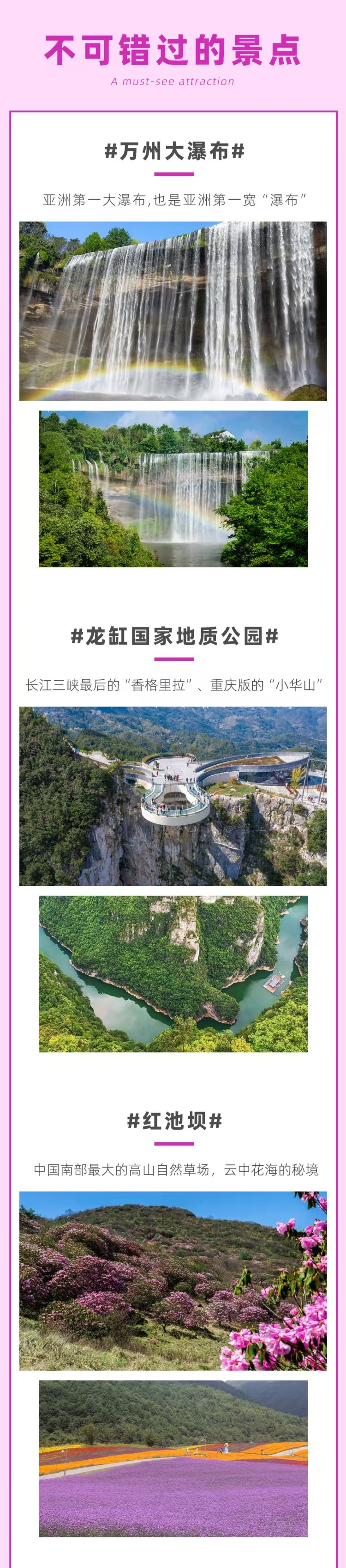 早上7:30最后一个集合点出发,我们一路高歌,每3小时进入服务区休息20分钟……中午服务区中餐,下午到达万州后可逛吃,看看万州不输洪崖洞的夜景,品尝正宗的万州烤鱼。