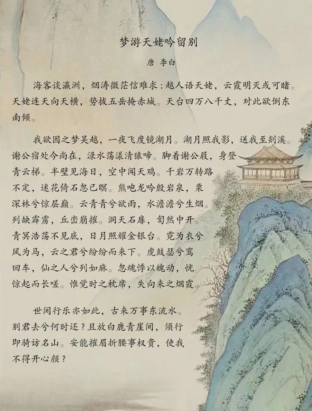 李白的《梦游天姥吟留别》以其奇幻的梦境、丰富的修辞和深刻的情感表达,展现了诗人内心的追求和不屈的精神。这首诗成为了唐代诗歌中独特的艺术珍品,也在后世影响深远,成为文学史上的经典之作。